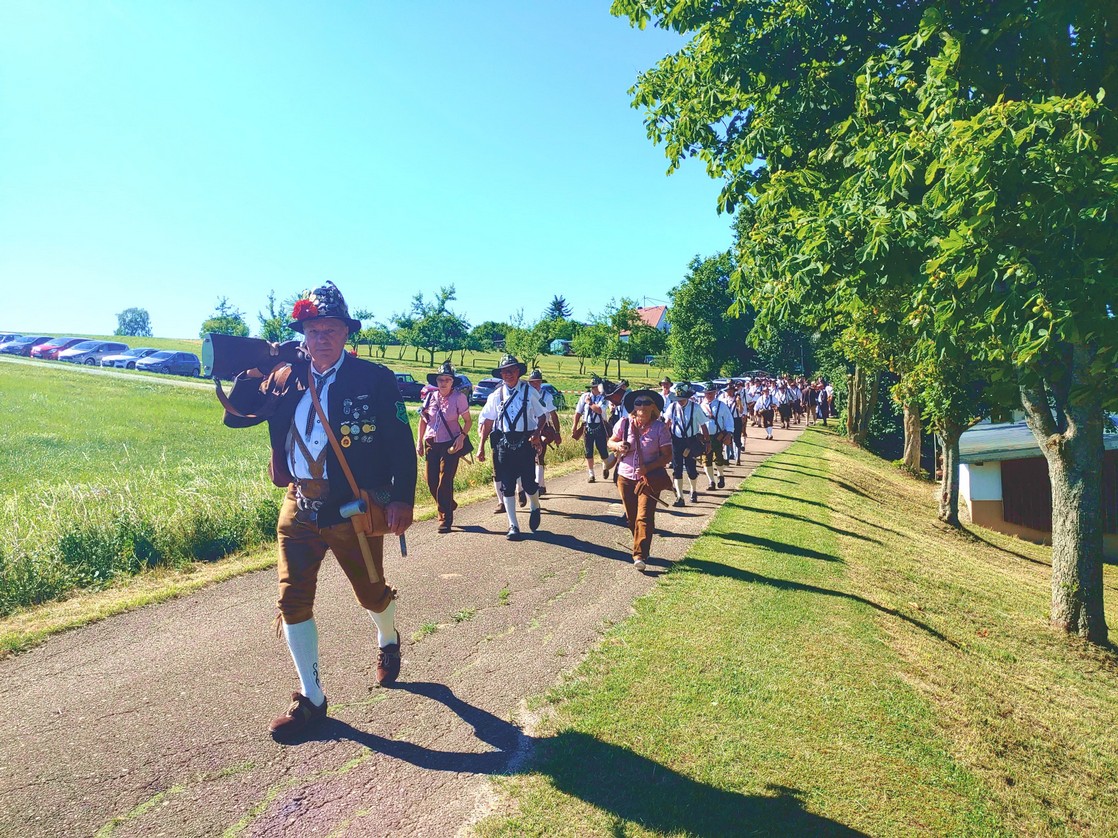 Am geschmückten Böllerkreuz eröffnete H.H. Pfarrer Scholz, bei herrlichstem Kaiserwetter, das Fest mit einer Andacht.